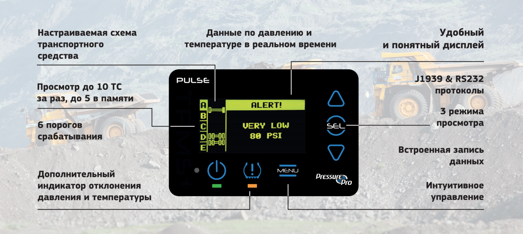 Система контроля давления PressurePro окупается в первые же месяцы эксплуатации. Ее использование позволяет повысить эффективность шин на 50%, сократить расход топлива в среднем на 8%, снизить простои техники по шинам на 100%.